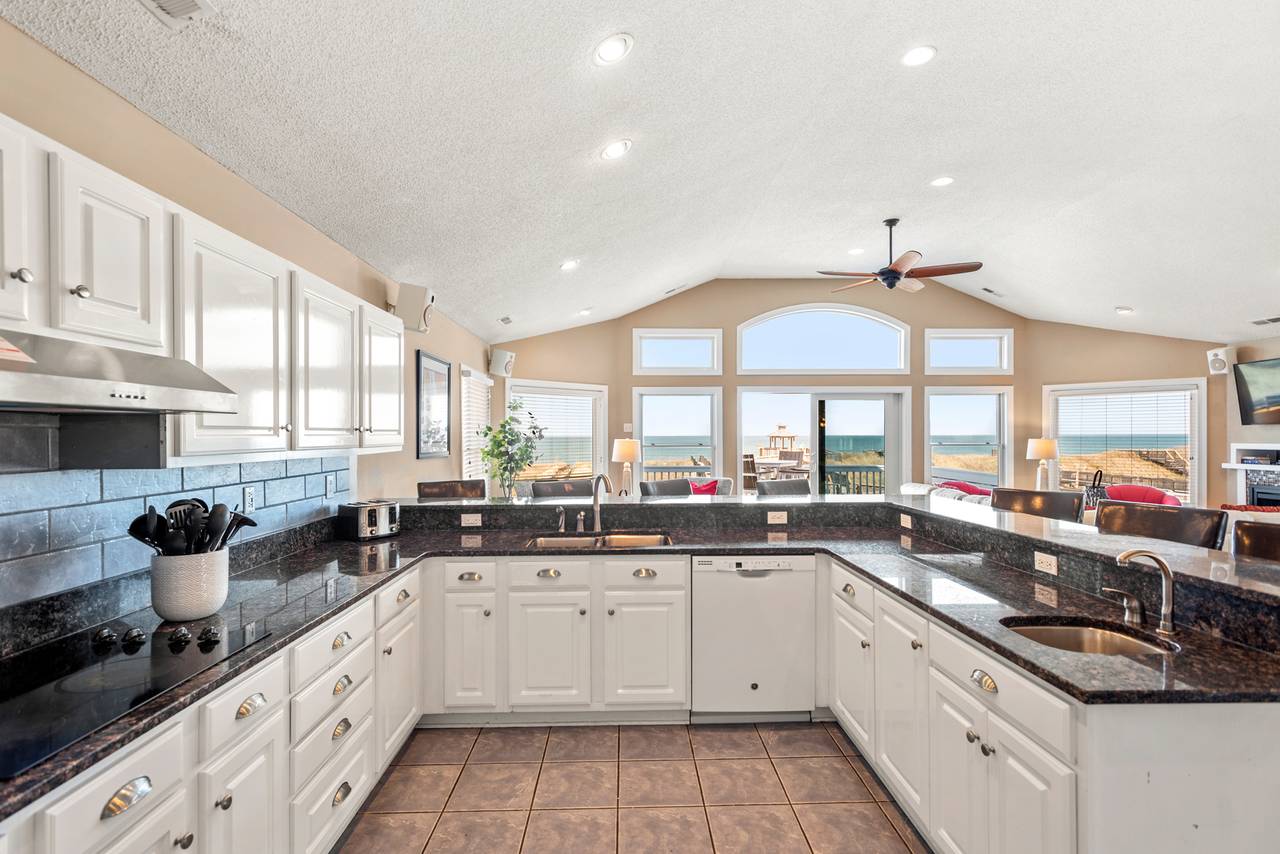 This bright and cheery kitchen with ocean views makes both meal prep and clean up a joy!