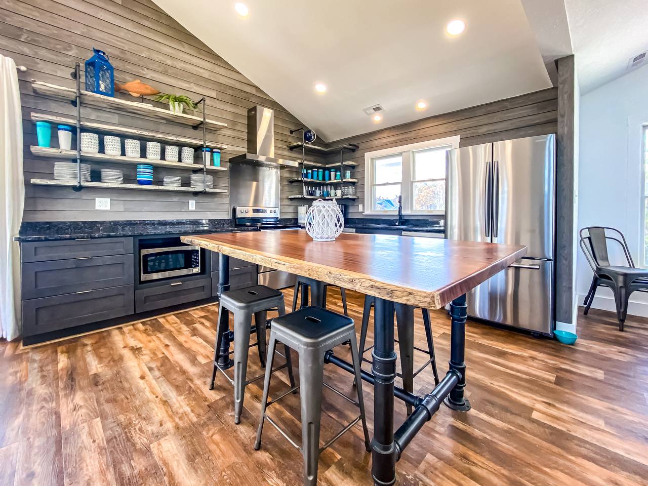 Custom cabinetry; open lumber shelving on black iron pipe frames; all stainless steel appliances; beautiful granite counter-tops; top of the line Kraus quartz composite sink with gooseneck faucet; and, new flooring make this kitchen an experience in and of itself.